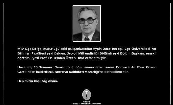 MTA Ege Bölge Müdürlüğü eski çalışanlarından Ayşin Dora` nın eşi, Ege Üniversitesi Yer Bilimleri Fakültesi eski Dekanı, Jeoloji Mühendisliği Bölümü eski Bölüm Başkanı, emekli öğretim üyesi Prof. Dr. Osman Özcan Dora vefat etmiştir.