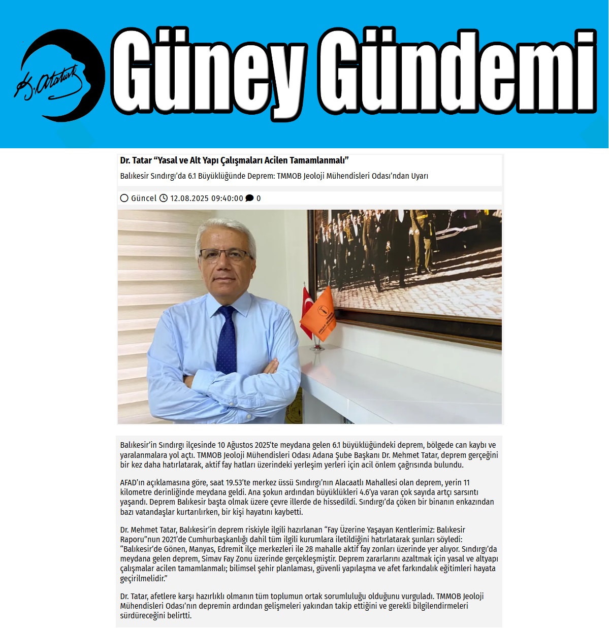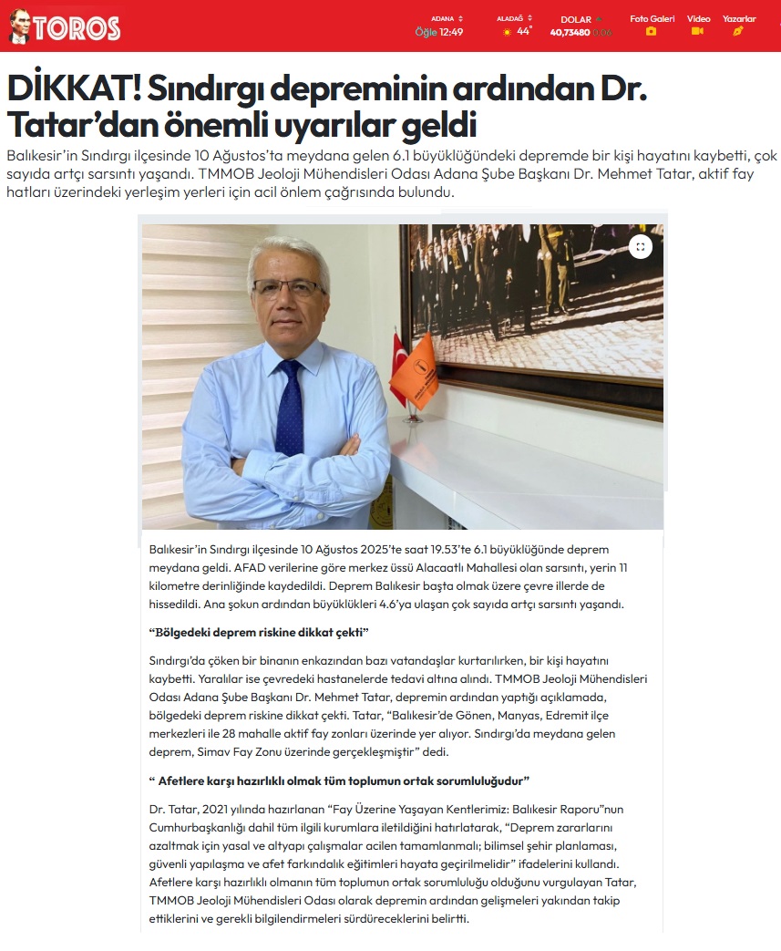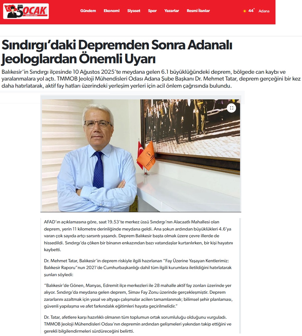 11.08.2025 tarihinde Şube Başkanımız Dr. Mehmet TATAR, 10 Ağustos 2025 tarihinde Balıkesir Sındırgı İlçesinde meydana gelen 6.1 büyüklüğündeki Deprem ile ilgili olarak basın açıklaması yapmıştır.