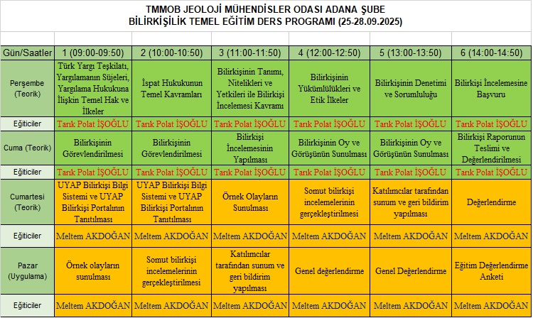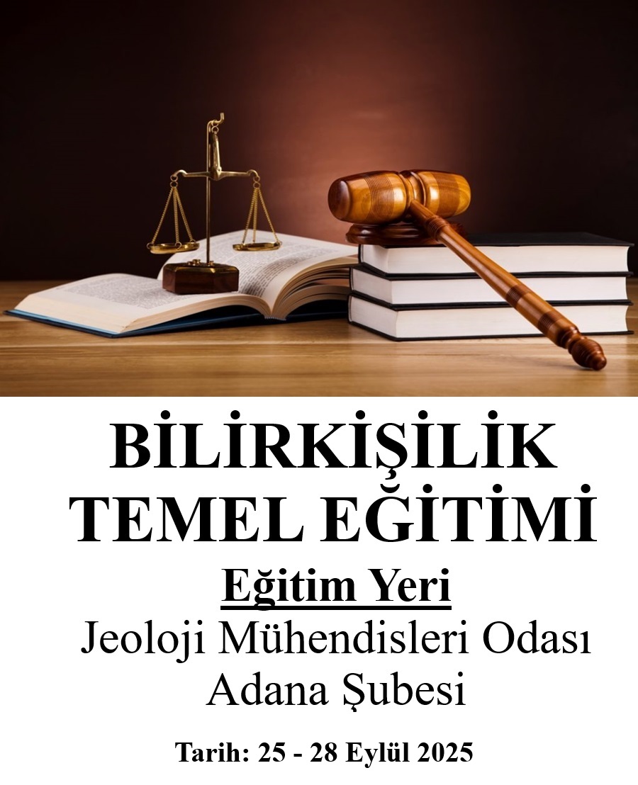 Buna göre Bilirkişilik Temel Eğitimi, 25 - 28 Eylül 2025 tarihleri arasında, TMMOB Jeoloji Mühendisleri Odası Adana Şubesi Eğitim Salonu`nda gerçekleştirilecektir.