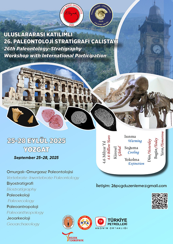 25 yıldır kesintisiz devam eden ve ilkinden itibaren çok sayıda bilim insanını ağırlayan Uluslararası katılımlı Paleontoloji-Stratigrafi Çalıştayının yirmi altıncısını 25-28 Eylül 2025 tarihleri arasında Yozgat’ta ve Yozgat Bozok Üniversitesi’nde düzenlenecek. Omurgalı-Omurgasız Paleontolojisi, Biyostratigrafi, Paleoantropoloji ve Jeoarkeoloji olarak belirlenen temalar ile düzenlenecek olan çalıştaya tüm meslektaşlarımız davetlidir. Alanında uzman yerli ve yabancı bilim insanlarını bir araya getiren çalıştayın amacı paleontoloji ve stratigrafideki en son bilimsel gelişmeleri uluslararası düzeyde tanıtmak ve tartışmaktır.