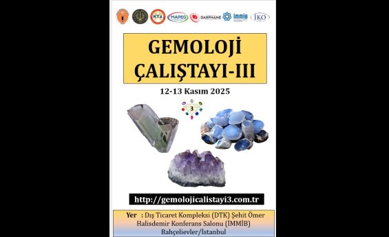 Gemoloji Çalıştayı-3, TMMOB Jeoloji Mühendisleri Odası İstanbul Şubesi, İstanbul Üniversitesi-Cerrahpaşa Jeoloji Mühendisliği Bölümü, Maden Tetkik ve Arama Genel Müdürlüğü (MTA), Maden ve Petrol İşleri Genel Müdürlüğü (MAPEG), Darphane ve Damga Matbaası Genel Müdürlüğü, İstanbul Maden ve Metaller İhracatçı Birlikleri (İMMİB), Mücevher İhracatçıları Birliği ve İstanbul Kuyumcular Odası (İKO) paydaşlığında, 12-13 Kasım 2025 tarihleri arasında, İMMİB-Dış Ticaret Kompleksi (DTK) Şehit Ömer Halisdemir Konferans Salonu’nda, İstanbul’da düzenlenecektir.