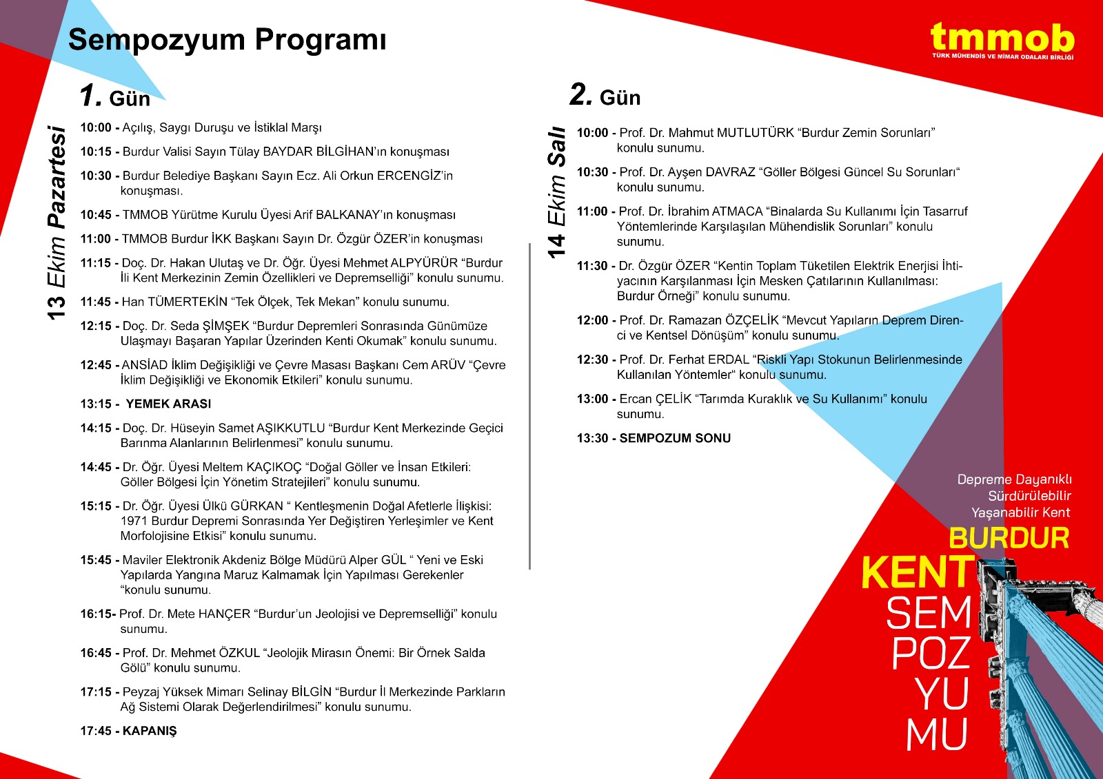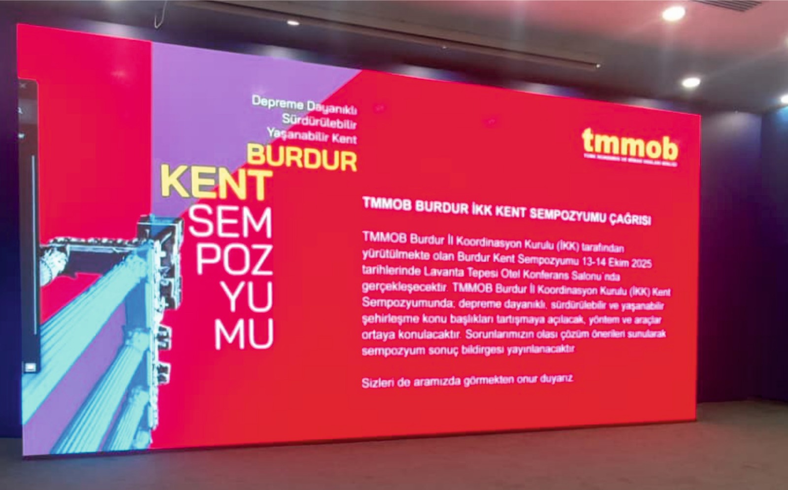 TMMOB adına düzenleyiciliğini TMMOB Burdur İl Koordinasyon Kurulu`nun üstlendiği TMMOB Burdur Kent Sempozyumu, "Depreme Dayanıklı, Sürdürülebilir, Yaşanabilir Kent" ana temasıyla, 13-14 Ekim 2025 tarihlerinde Lavanta Tepesi Otel Konferans Salonu’nda gerçekleştirildi.