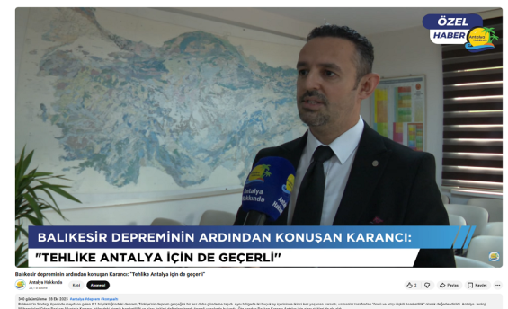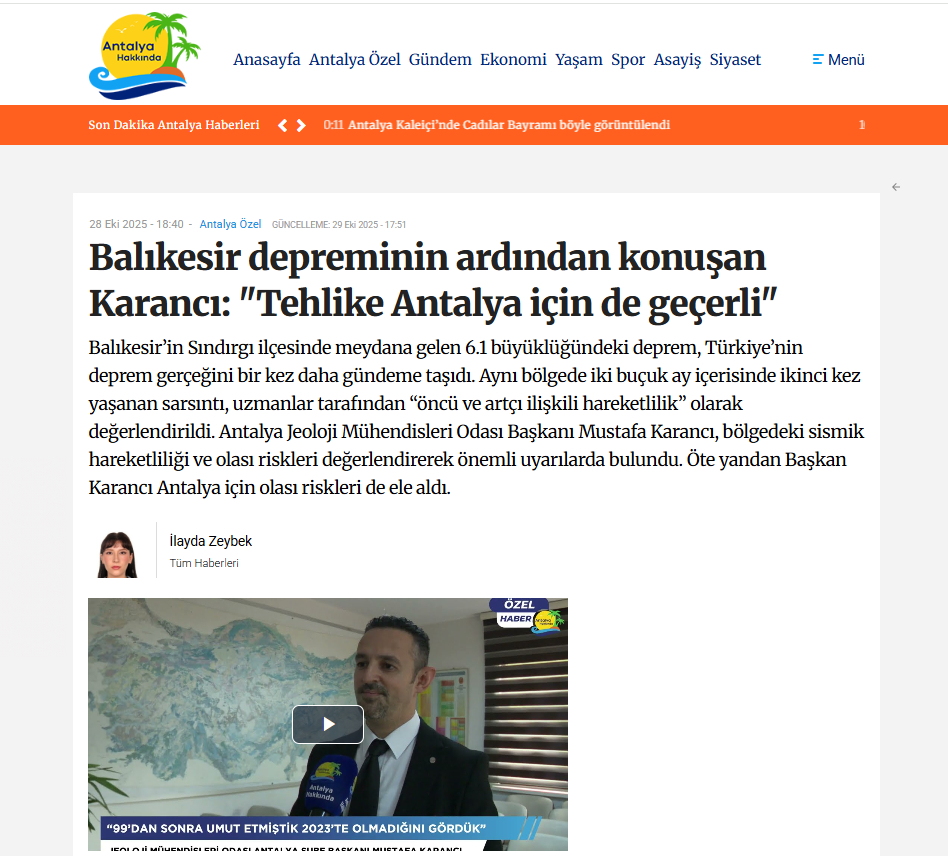 Şube Başkanımız Mustafa Karancı 28 Ekim 2025 tarihinde Antalya Hakkında`ya , Balıkesir’in Sındırgı ilçesinde meydana gelen 6.1 büyüklüğündeki deprem sonrası bölgedeki sismik hareketliliği ve olası riskleri değerlendirerek, Antalya için olası riskleri ele aldı ve önemli uyarılarda bulundu.