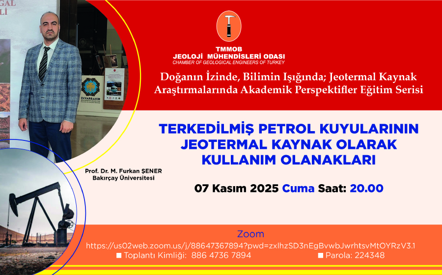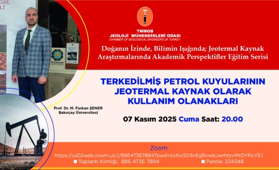 Jeotermal Kaynaklar ve Doğal Mineralli Sular Komisyonumuz tarafından Doğanın İzinde, Bilimin Işığında; Jeotermal Kaynak Araştırmalarında Akademik Perspektifler Eğitim Serisi kapsamında " Terk Edilmiş Petrol Kuyularının Jeotermal Kaynak Olarak Kullanım Olanakları” başlıklı çevrimiçi eğitim düzenlenecektir.