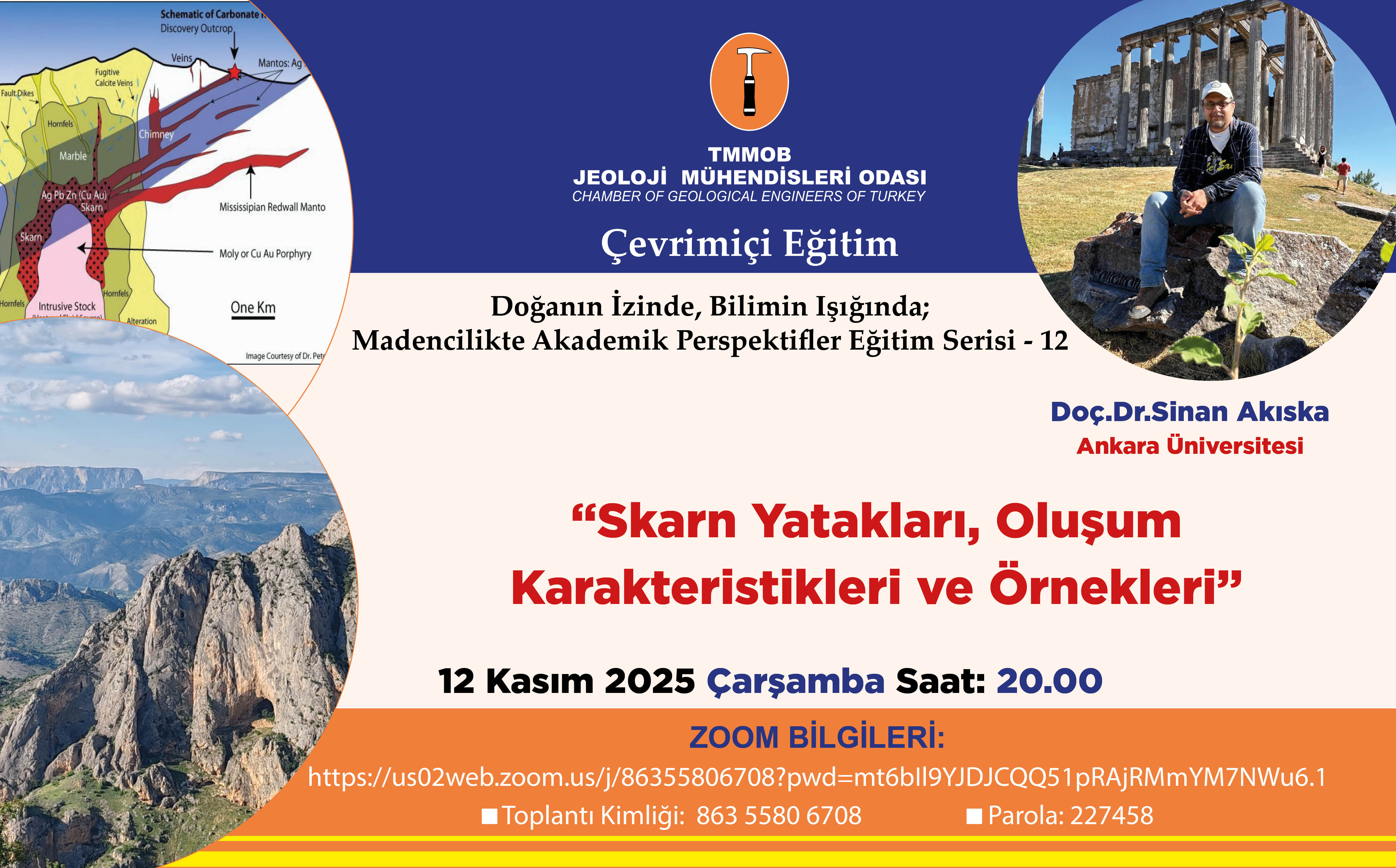 Madencilik Komisyonumuz tarafından Doğanın İzinde, Bilimin Işığında; Madencilikte Akademik Perspektifler Eğitim Serisi kapsamında "Skarn Yatakları: Oluşum Karakteristikleri ve Örnekleri" başlıklı çevrimiçi eğitim düzenlenecektir.