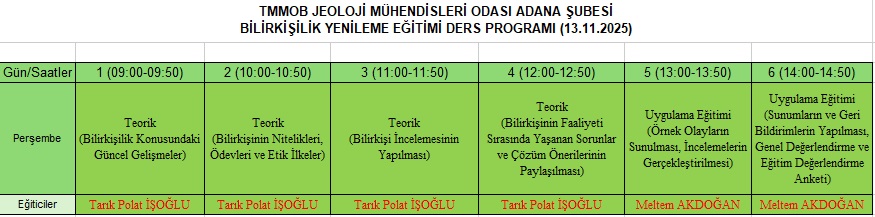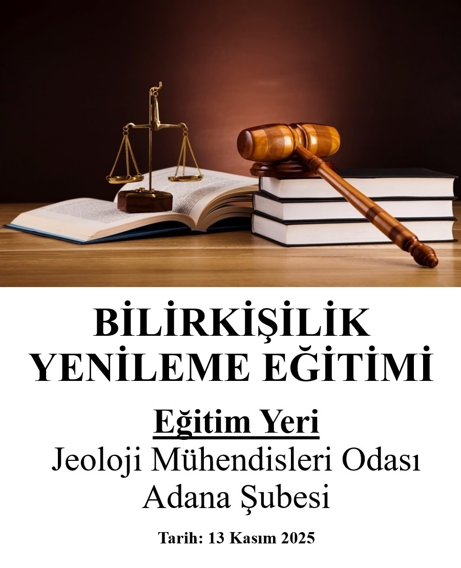 Buna göre Bilirkişilik Yenileme Eğitimi, 13 Kasım 2025 tarihinde, TMMOB Jeoloji Mühendisleri Odası Adana Şubesi Eğitim Salonu`nda gerçekleştirilecektir.