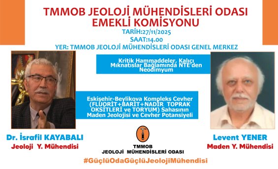 Odamızın Emekli Komisyonu tarafından 27 Kasım Perşembe günü saat 14.00`de TMMOB Jeoloji Mühendisleri Odası Genel Merkez Binası’nın Konferans Salonu`nda Jeoloji Yüksek Mühendisi Dr. İsrafil KAYABALI tarafından ``Eskişehir-Beylikova Kompleks Cevher (FLUORİT+BARİT+NADİR TOPRAK OKSİTLERİ ve TORYUM) Sahasının Maden Jeolojisi ve Cevher Potansiyeli`` başlığı ve Maden Yüksek Mühendisi Levent YENER tarafından ``Kritik Hammaddeler, Kalıcı Mıknatıslar Bağlamında NTE’den Neodimyum`` başlığı ile söyleşi düzenlenecektir.