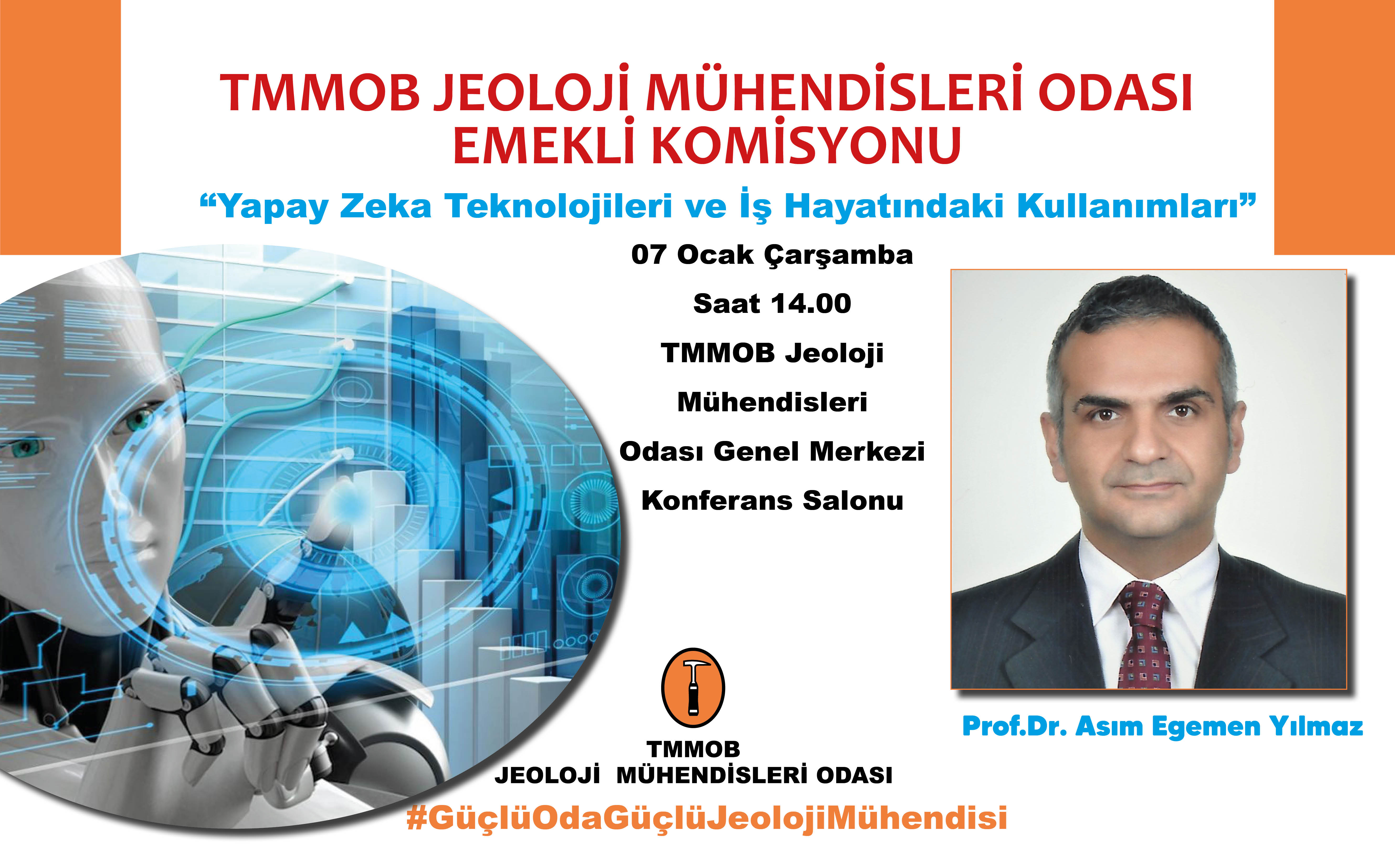 Odamızın Emekli Komisyonu tarafından 7 Ocak Çarşamba günü saat 14.00`de TMMOB Jeoloji Mühendisleri Odası Genel Merkez Binası’nın Konferans Salonu`nda Sayın Prof. Dr. Asım Egemen Yılmaz tarafından “Yapay Zeka Teknolojileri ve İş Hayatındaki Kullanımları” başlığı ile söyleşi düzenlenecektir.