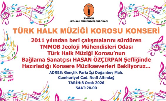 2011 yılından beri çalışmalarını sürdüren TMMOB Jeoloji Mühendisleri Odası Türk Halk Müziği Korosu’nun Bağlama Sanatçısı HASAN ÖZÇIRPAN şefliğinde hazırladığı konsere müzikseverleri bekliyoruz...