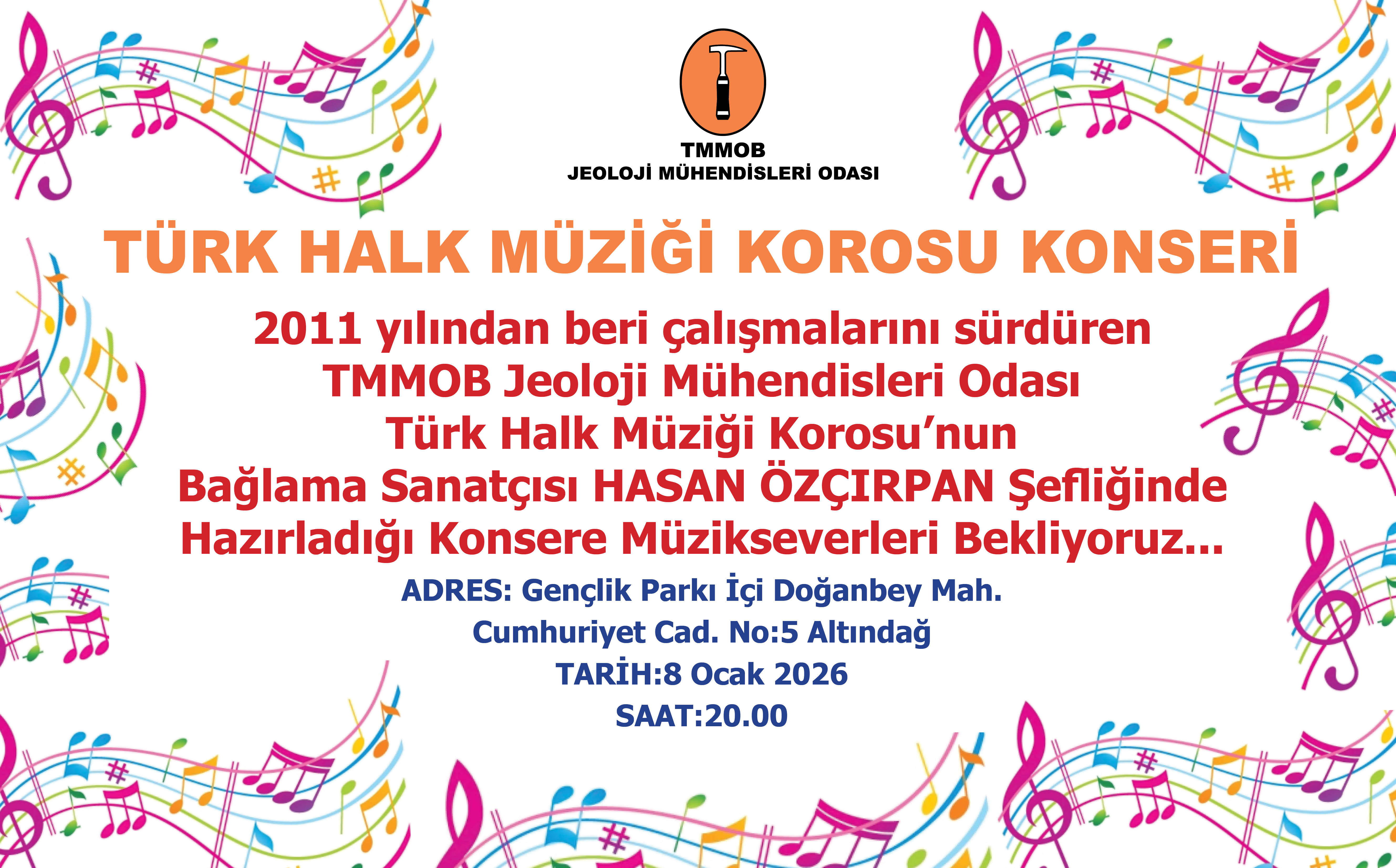 2011 yılından beri çalışmalarını sürdüren TMMOB Jeoloji Mühendisleri Odası Türk Halk Müziği Korosu’nun Bağlama Sanatçısı HASAN ÖZÇIRPAN şefliğinde hazırladığı konsere müzikseverleri bekliyoruz...