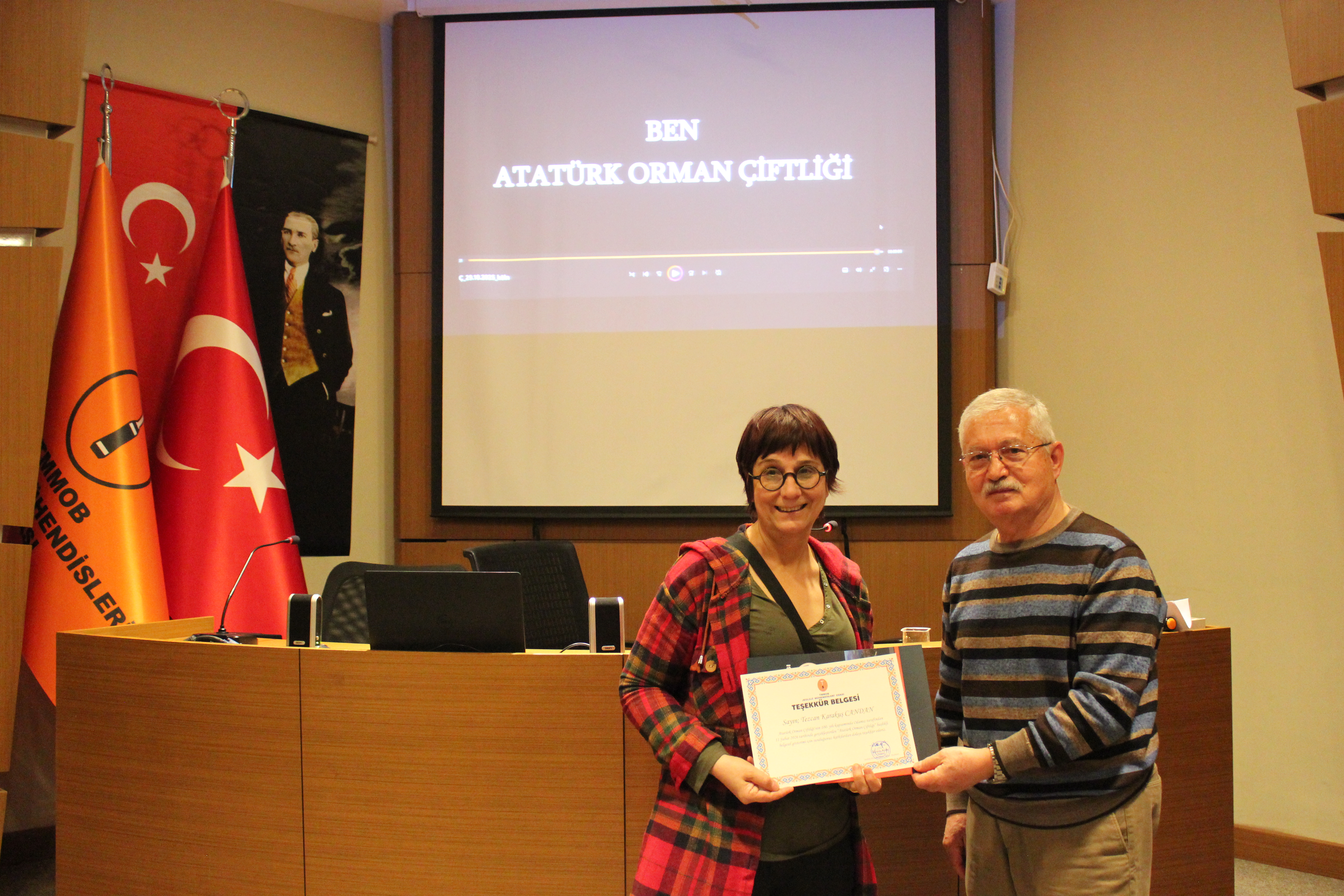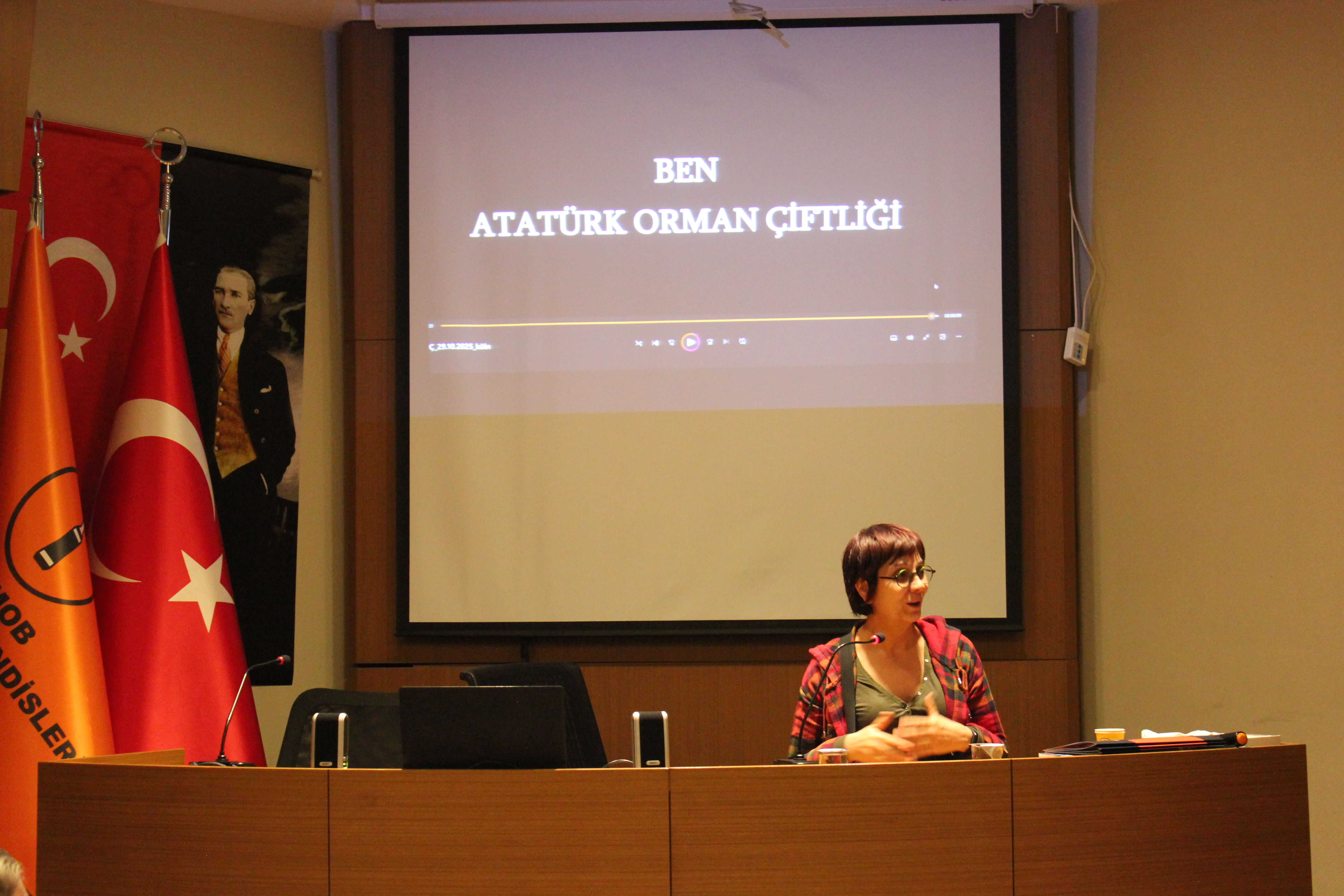 Türkiye Cumhuriyeti`nin önemli miraslarından Atatürk Orman Çiftliği (AOÇ)`nin kuruluşunun 100. yılı kapsamında hazırlanan Çiğdem Toker, Canan Güllü, Nihal Kemaloğlu, Aksel Kemaloğlu, Redife Kolçak, Gökçe Bolat ile Tezcan Karakuş Candan`ın seslendirdiği "Ben Atatürk Orman Çiftliği" başlıklı belgesel gösterimi saat 14.00`te TMMOB Jeoloji Mühendisleri Odası Genel Merkez Binası’nın Konferans Salonu`nda Mimar, Yazar ve Yönetmen Tezcan Karakuş Candan tarafından gerçekleştirildi.