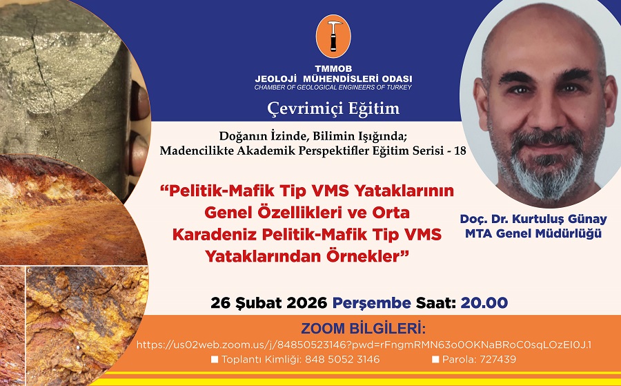 Madencilik Komisyonumuz tarafından Doğanın İzinde, Bilimin Işığında; Madencilikte Akademik Perspektifler Eğitim Serisi kapsamında "Pelitik-Mafik Tip VMS Yataklarının Genel Özellikleri ve Orta Karadeniz Pelitik-Mafik Tip VMS Yataklarından Örnekler" başlıklı çevrimiçi eğitim düzenlenecektir.
