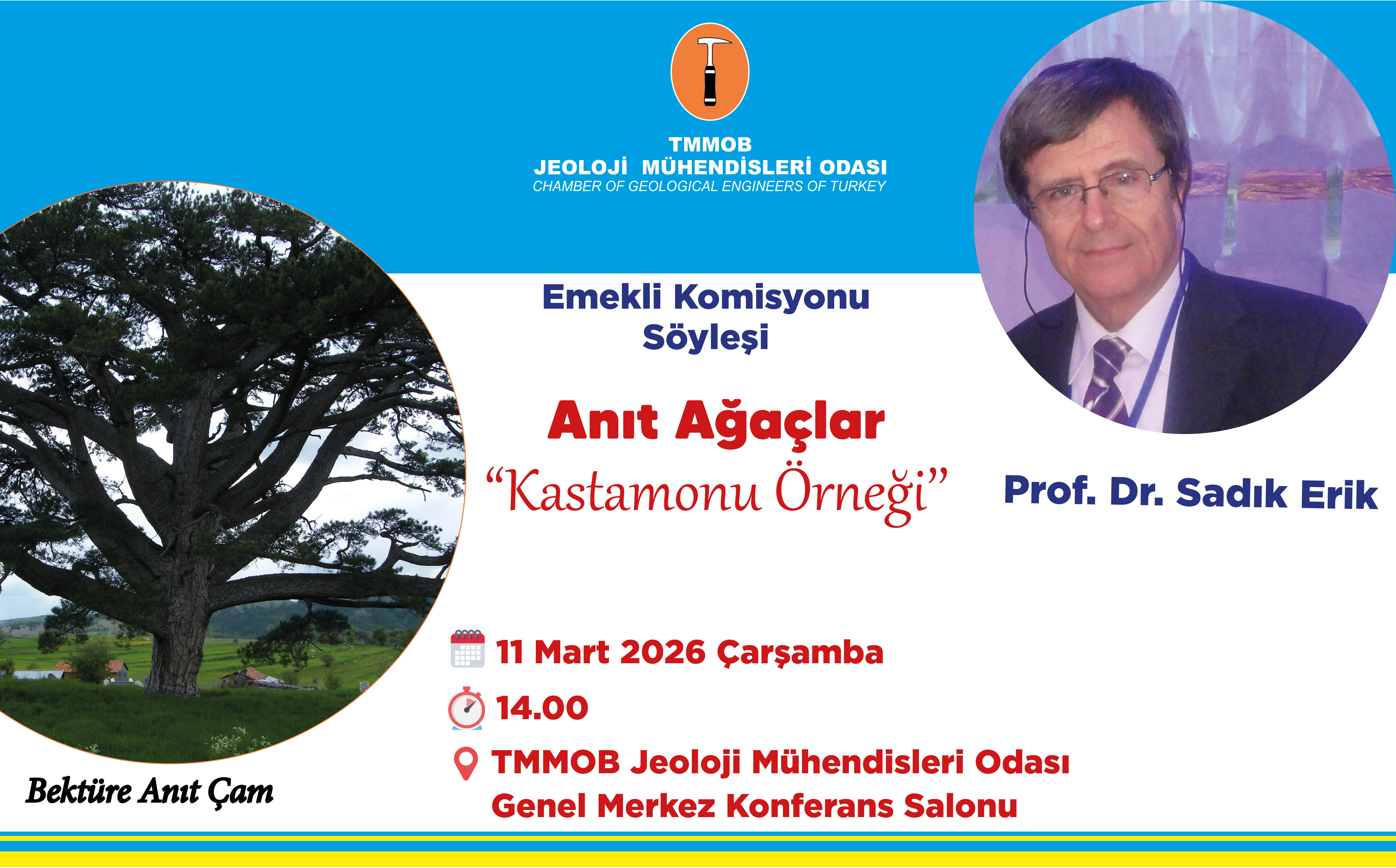Odamızın Emekli Komisyonu tarafından 11 Mart 2026 Çarşamba günü saat 14.00`te TMMOB Jeoloji Mühendisleri Odası Genel Merkez Konferans Salonu`nda Sayın Prof. Dr. Sadık Erik tarafından Anıt Ağaçlar “Kastamonu Örneği’’ konu başlığı ile söyleşi düzenlenecektir.
