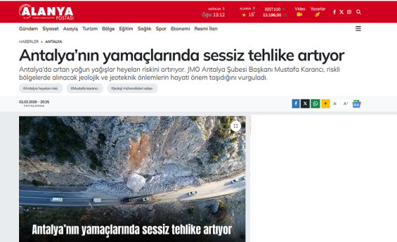 Şube Başkanımız Mustafa Karancı 2 Mart 2026 tarihinde Alanya Postası Gazetesi`ne "Heyalan ve riskli bölgelerde jeolojik ve jeoteknik önlemlerin alınması " hakkında açıklamalarda bulundu.