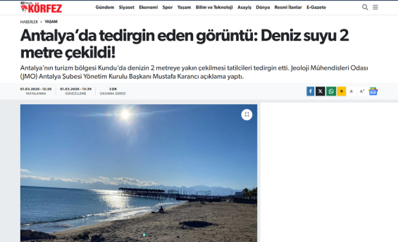 Şube Başkanımız Mustafa Karancı, 1 Mart 2026 tarihinde Antalya Körfez Gazetesi`ne Antalya`nın en önemli turizm bölgelerinden biri olan Kundu sahilinde deniz suyunun çekilmesi hakkında açıklamalarda bulundu.