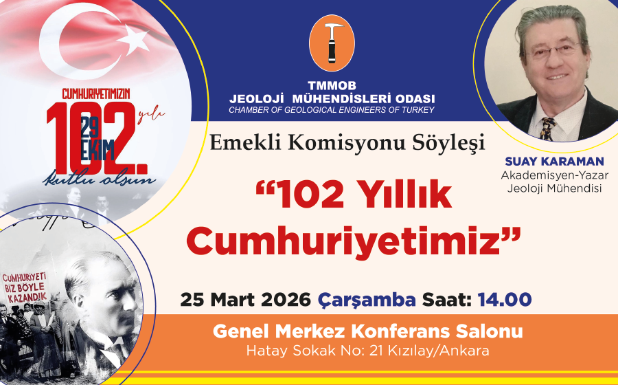 Odamızın Emekli Komisyonu tarafından 25 Mart 2026 Çarşamba günü saat 14.00`te TMMOB Jeoloji Mühendisleri Odası Genel Merkez Konferans Salonu`nda Sayın Suay Karaman tarafından “102 Yıllık Cumhuriyetimiz” konu başlığı ile söyleşi düzenlenecektir.