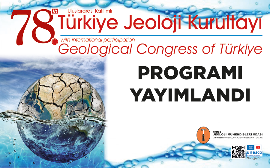 78. Türkiye Jeoloji Kurultayı bu yıl “Su, Kuraklık, İklim Değişikliği ve Jeoloji” ana teması ile gerçekleştirilecek olup, ana temanın yanında jeoloji bilim ve mühendisliğinin farklı alanlarında çok sayıda oturum, sergi, panel, teknik gezi, belgesel gösterimi ve sosyal etkinlikler ile tam bir şölen havasında gerçekleştirilecek olup, meslektaşlarımız başta olmak üzere tüm halkımızın katılımına açıktır.