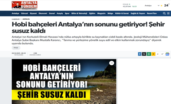 Şube Başkanımız Mustafa Karancı 16 Eylül 2025 tarihinde Güncel Antalya`ya "Antalya Su Potansiyeli ve Önlemlerin Alınması " hakkında röportaj verdi.